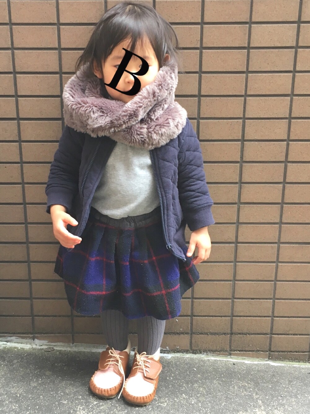 車&ショッピングモールの時はキルティングの上着とスヌードの事が多い。 靴は自分でチョイス。 スカートはこの冬でサイズアウトぽいなー。