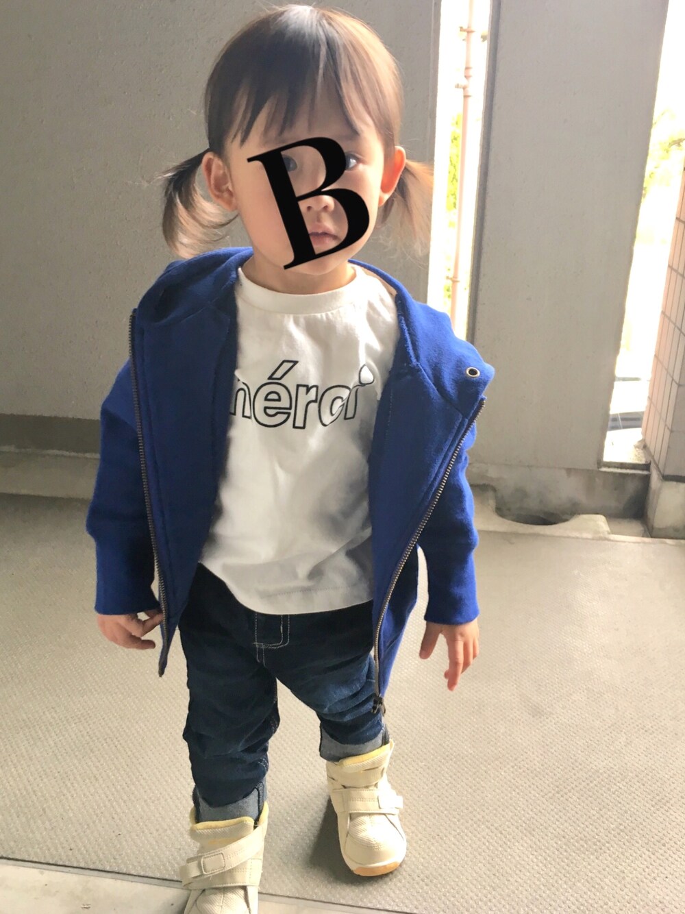 スウェットパーカーとスニーカーは男の子からのおさがり。 パーカーは95cm Tシャツは2サイズ大きめで100cm。 デニムは90cm。