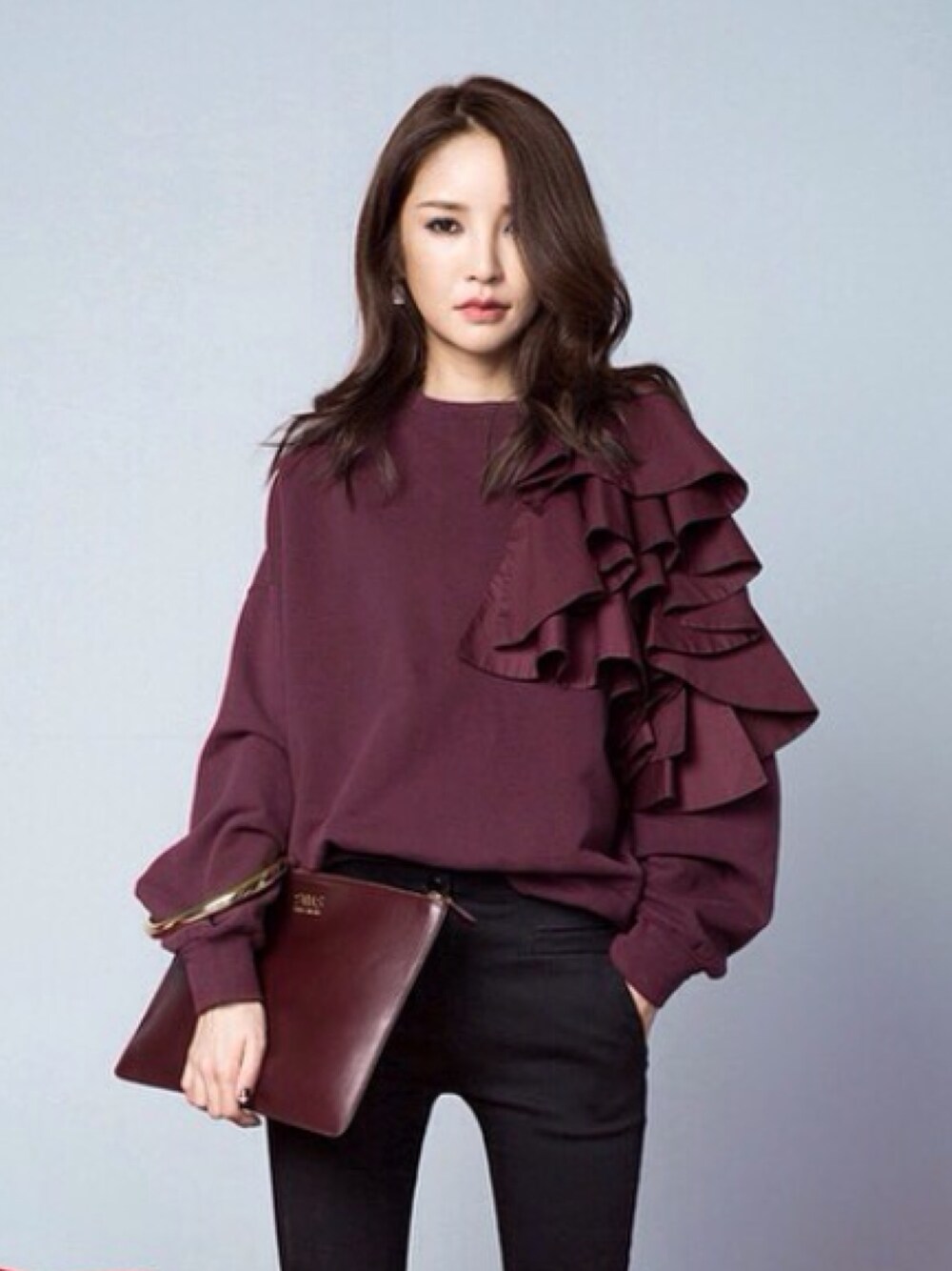レッド系のスウェットを着用したレディースの秋コーディネートの1枚目の写真
