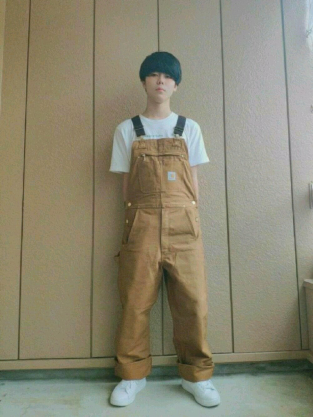 Carharttのオーバーオール 色合いが好きすぎる♡ 必ず手を中に入れたくなるらしい😂 中1