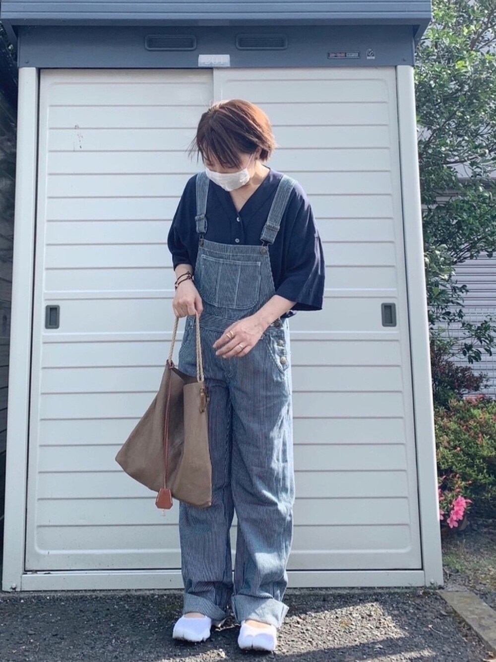 ヒッコリーのオーバーオールはノーブランドのものです☺︎ しかし夫がひっそりダメ出ししてきたのでこの後すぐにオーバーオールをインにして上からシャツをはおりました。