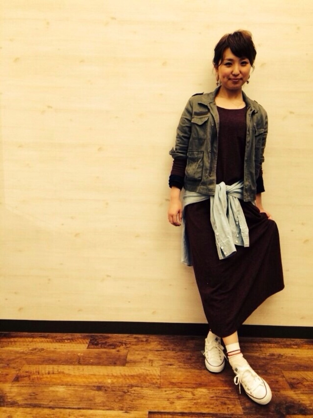 マキシワンピ:gu 腰に巻いたシャツ:SLY 靴下:靴下屋 スニーカー:コンバース