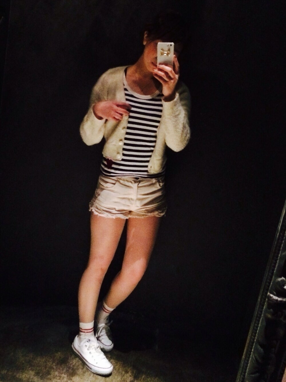 Tシャツ:アニエンス カーディガン:スナイデル ボトムス:スナイデル 靴下:靴下屋 スニーカー:コンバース