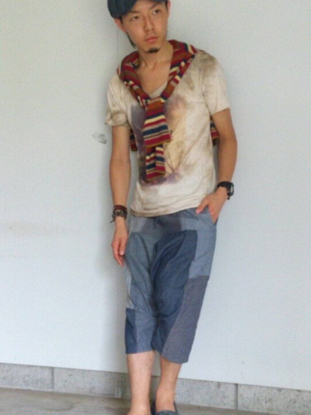 前回のTシャツコーディネートをベースにはしていますが、デニム素材スリッポンと同系色のパッチワークパンツと足元をブルー系にまとめて、ラフカジュアルを全面に出しながら夏らしい清潔感をしっかり残すことを意識したことがポイントです(2013/8/10)