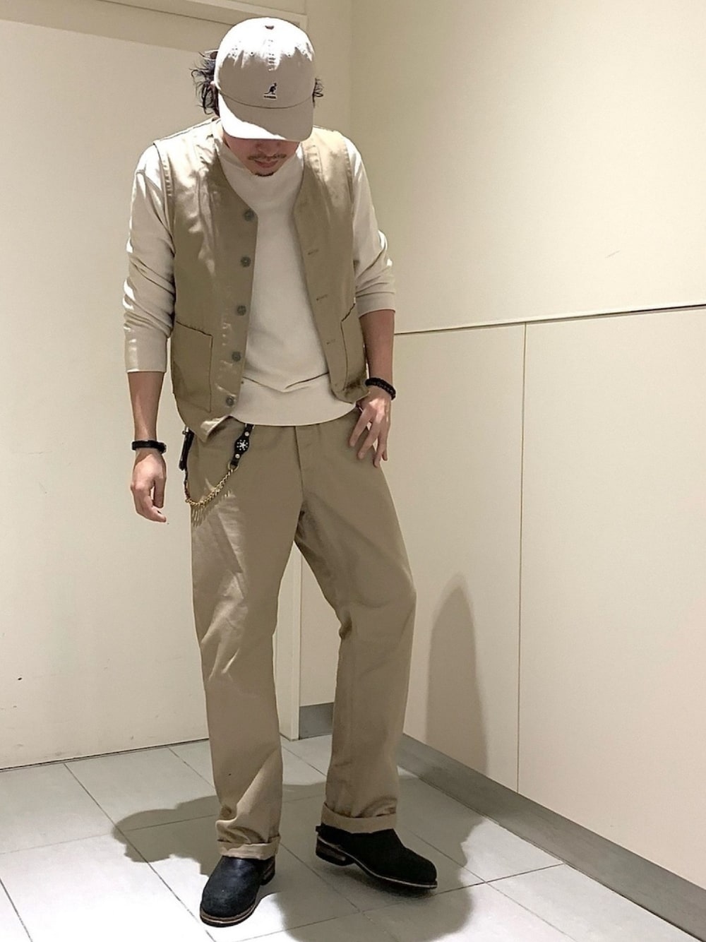 KANGOLコーデ✨ セットアップとキャップの ワーカーアメカジコーデ🇺🇸 シンプルなワントーンと 足元はエンジニアブーツで🙆♂️