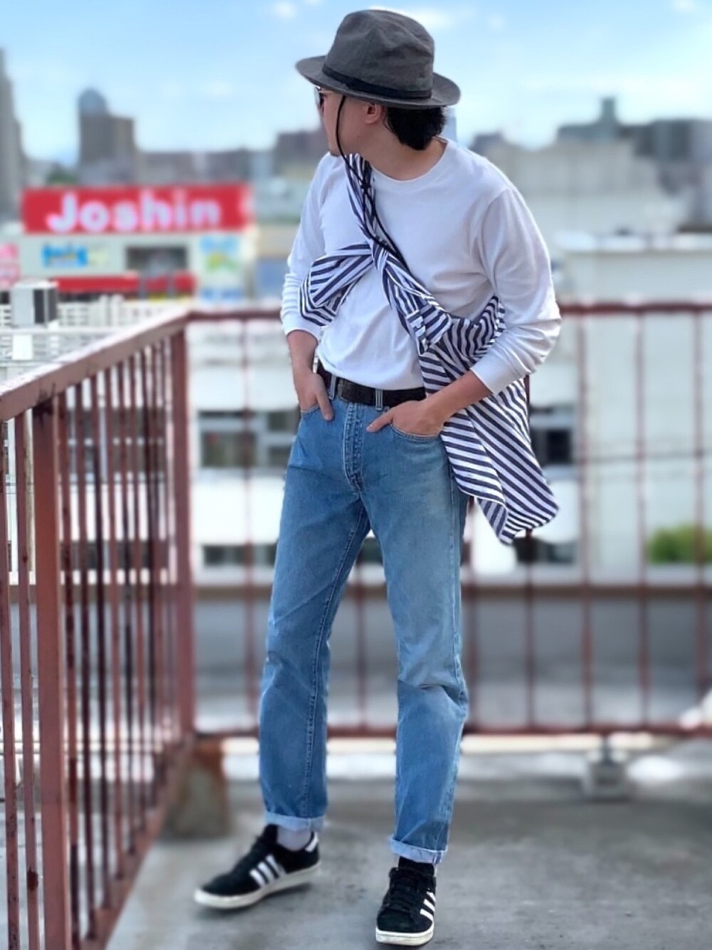 やってみたかった たすき掛けコーデ😂笑 アメカジ要素も残しつつ 爽やかな海岸沿いコーデを 意識してしました✨ ハットは流行りの紐付きで 風が強くても安心です🎩