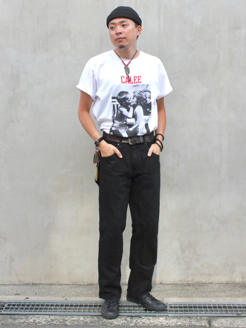 モノトーンコーデ🙆♂️✨ 最近購入したcaleeのtシャツは グラフィックが可愛くて お気に入り☀️ デニムにタックインして アメカジコーデです🇺🇸