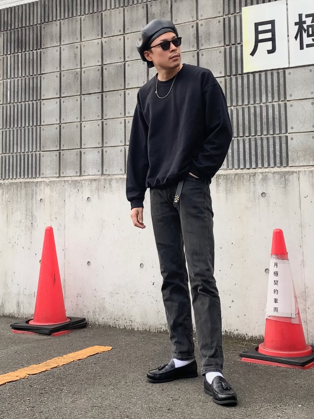 おはようございます☀️ 本日は大人のブラックコーデ🔥 すこしゆったりめのトレーナーに ボトムスはスッキリと細身のブラックデニム。 シューズはローファーで大人っぽく。 小物はレザーキャスで控えめに🙆♂️