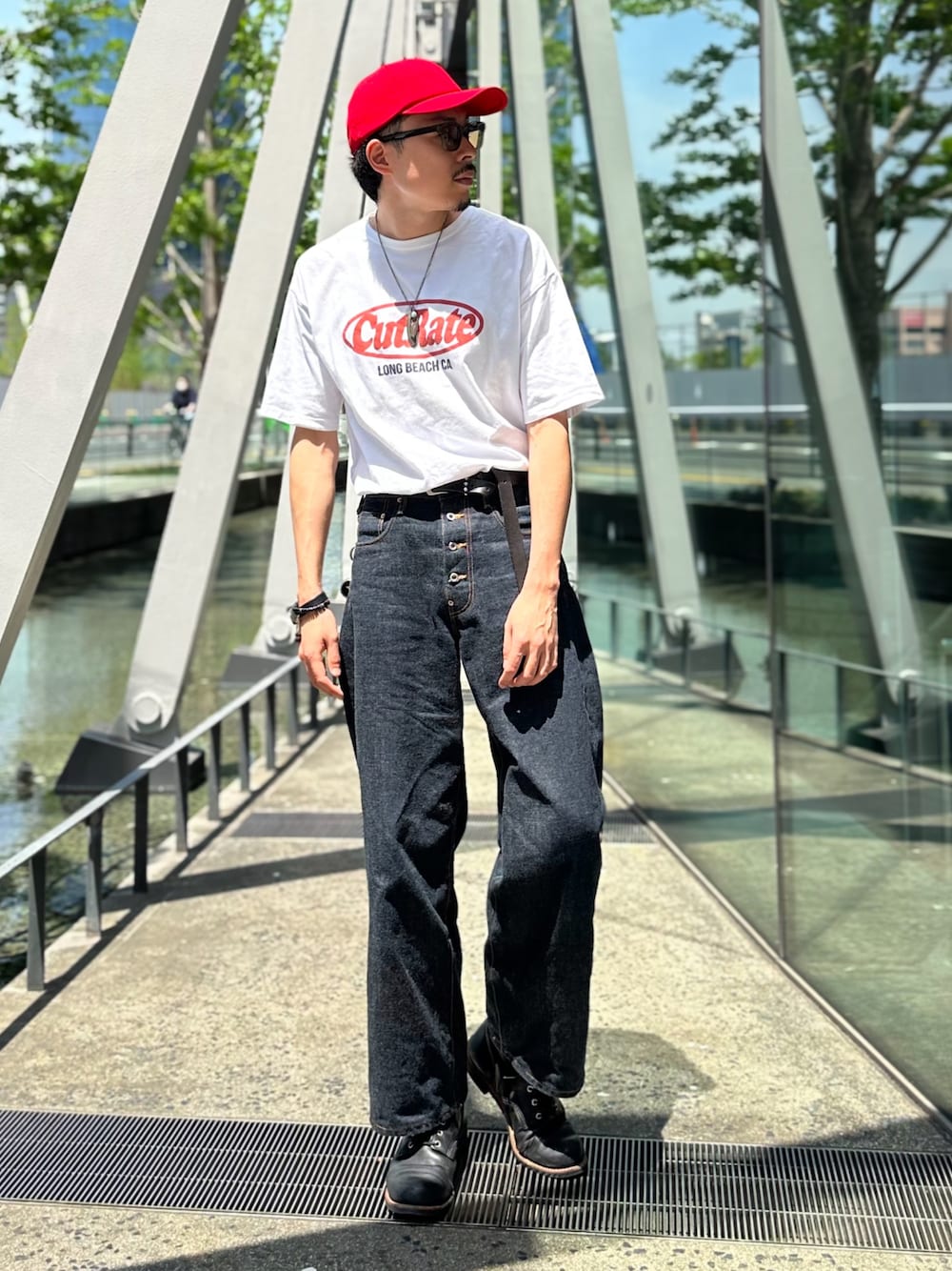 おはようございます☀ 本日は差し色レッドのアメカジコーデ🔥 Tシャツのプリントとキャップの色合わせを 意識しました✨