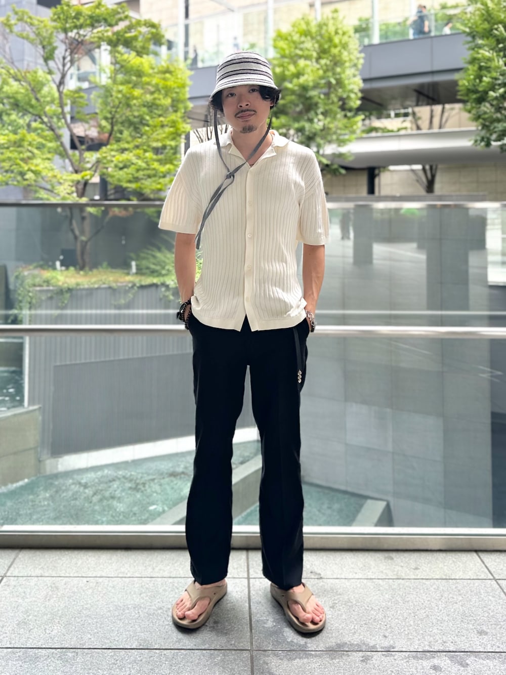 おはようございます☀ 本日はリゾート感ある ゆったりとしたコーディネート☀️ ニットシャツ、パイル生地のハット、サンダルとゆったりとしたイメージのアイテムをメインに ボトムスをスラックスで大人っぽくミックスしました✨