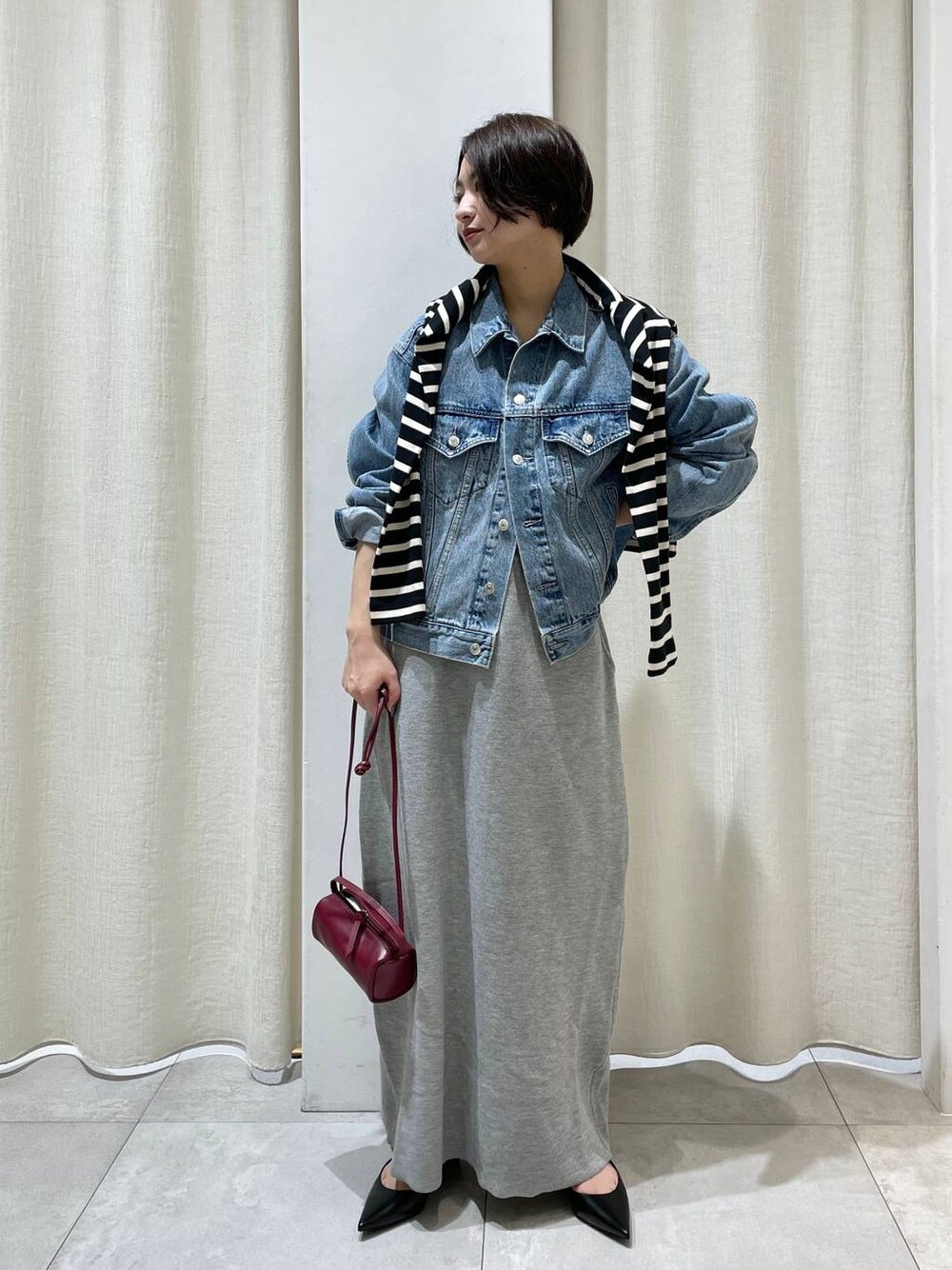 柔らかい生地のニットスカートにgジャンを合わせました!! ポイントにボーダーのカットソーを肩掛けしてます💫
