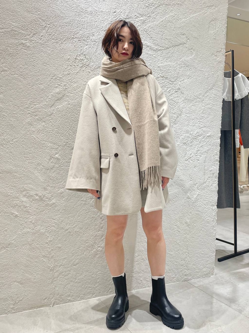 ジャケット感覚で羽織れるコートです! 色のトーンはまとめつつ、足元は黒でしっかり締めてます✨