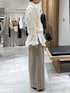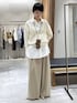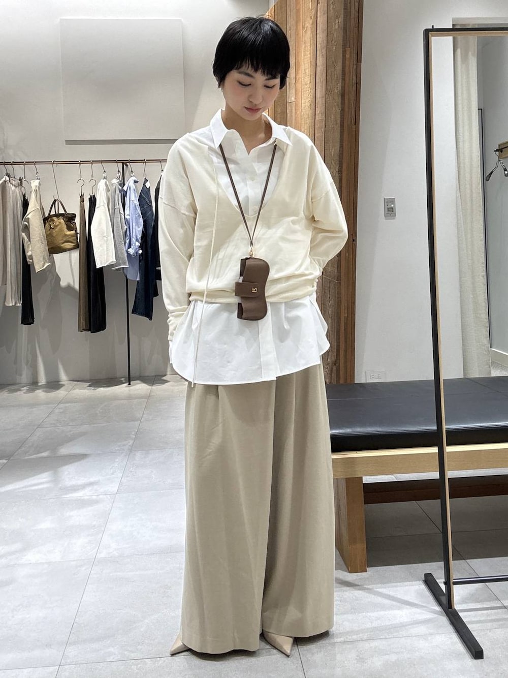 トップス 薄手の2wayカットソーです。 前後で着用可能で、雰囲気を変えられます。 肌触りがよく、素肌に着てもちくちくしません。 合わせやすいカラーで着回し抜群です。 パンツ とろみのあるタックが特徴のパンツです。 スラックスのような雰囲気もありつつ、かっちりし過ぎないパンツです。 生地は薄手なので暖かい時期も履きやすいです。