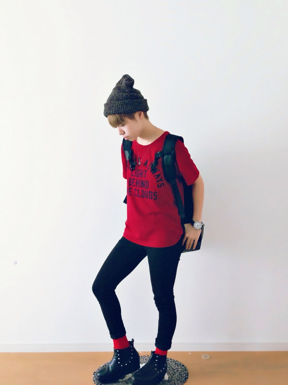 シンプルすぎたから赤い靴下履いたら秋ぽくなりました。 TシャツはZOOIさん パンツはUNIQLO 最近、ニット帽に依存しすぎてやばい…笑