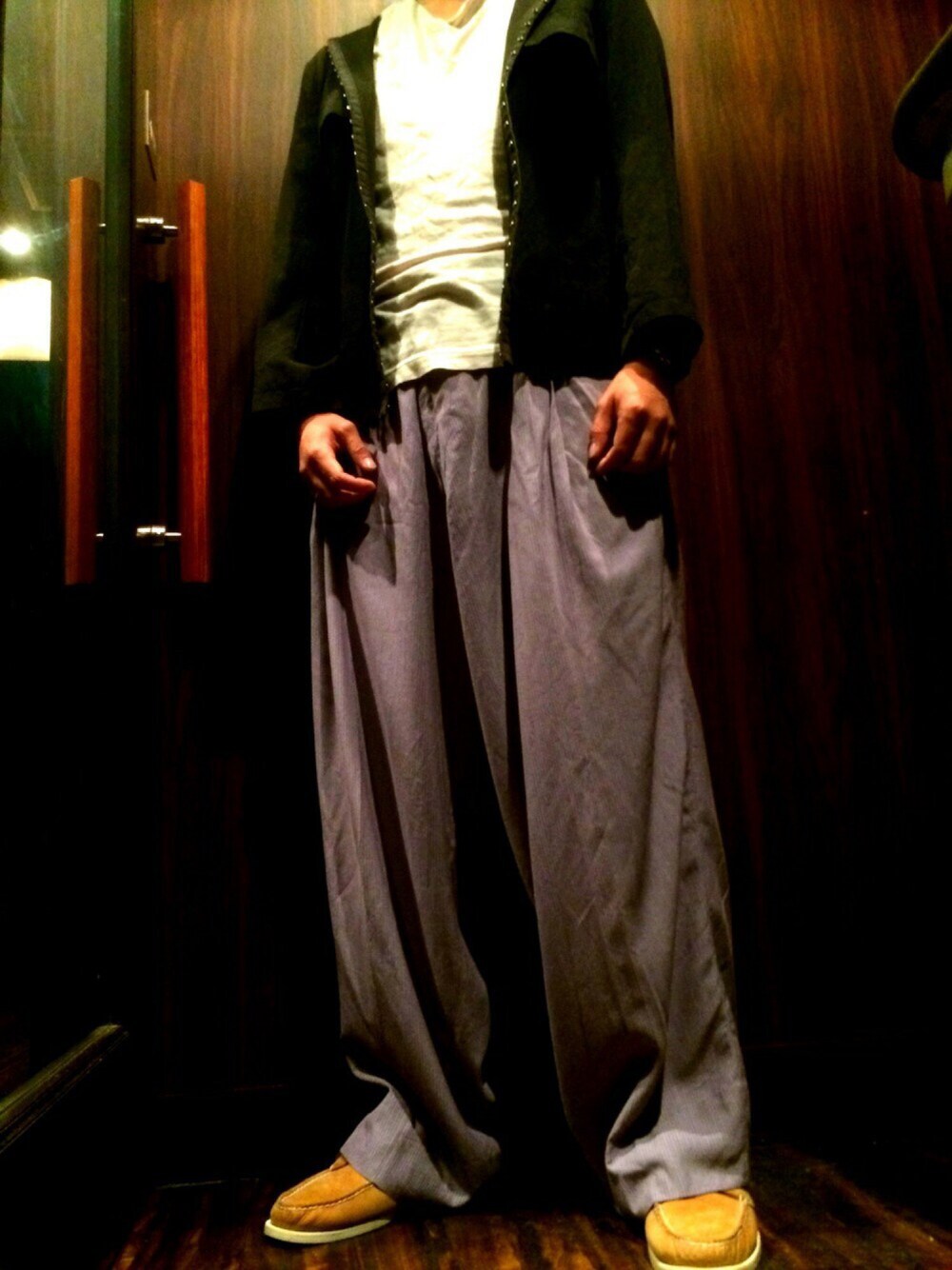 見えづらいけど、スリータックのパンツ。 かなりゆるく見えるし、ドレープ感が出るので動きがあって割と好き。 トップスも、かなり派手な感じだけれど丈も含めて割と好き。