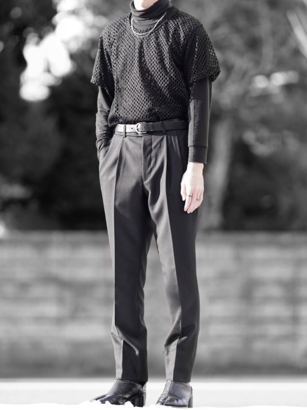 ギャルソンの19awのメッシュTをつかったコーデです。 パンツはサリバンのウールタックパンツ ブーツはマルジェラの足袋で合わせ モードモードに😂 (Instagram) nasa.0000