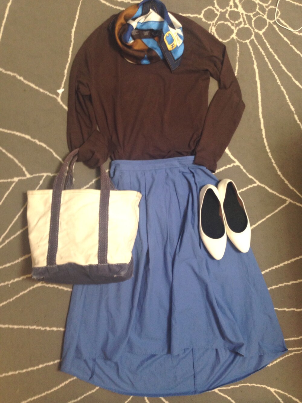 アズールデマローネ。 スカーフから組み立てたコーデ。 無印良品の長袖はメンズのお買い得コーナーで。