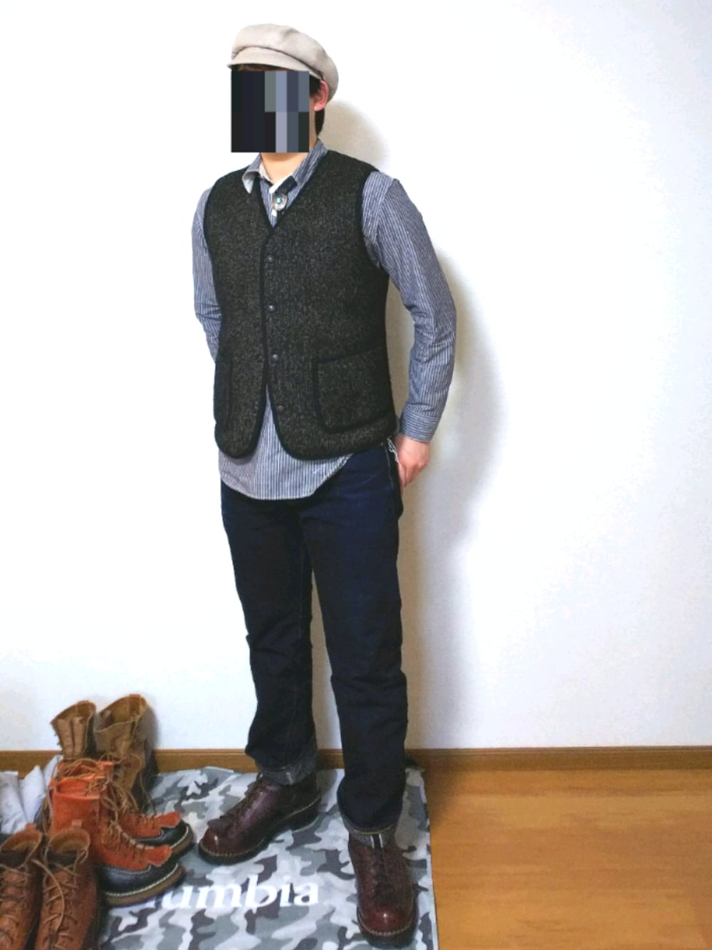 野暮ったいのに綺麗にも見えるアメカジ ジョンロフグレンのワークシャツにCOOTIEのビーチベストがよく合います ジーンズを細身のもののするとさらにキレイめになるかも?