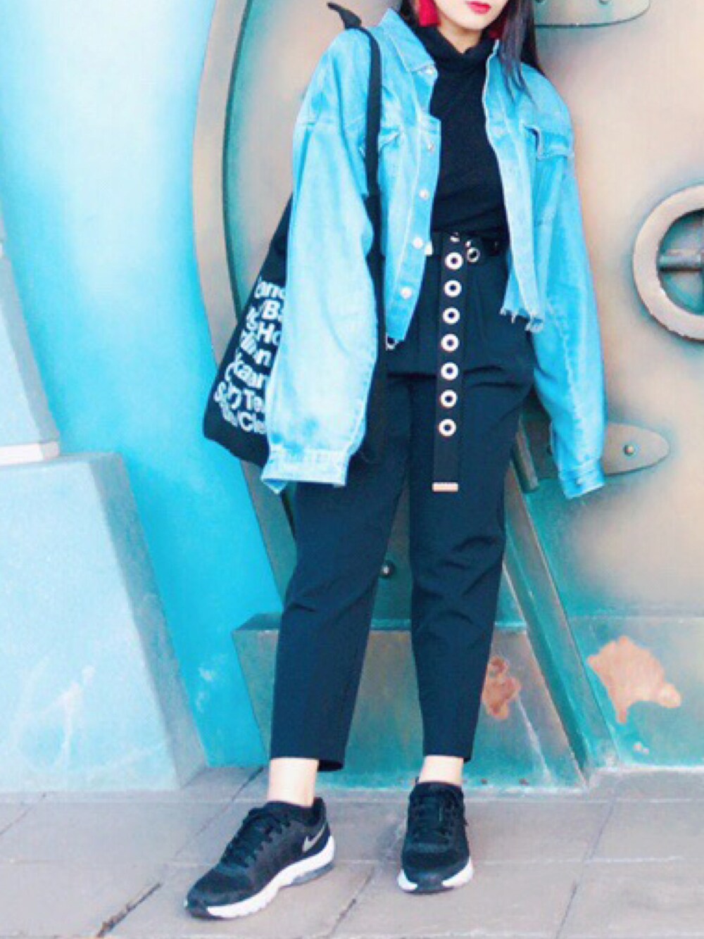 これまた11月のディズニーの写真です🤳 ディズニー行きすぎですね笑 そして写真あげるの遅くなりました アウターとして着ているのは下北沢のWEGOで買ったリメイク古着です!ショート丈で裾がダメージになっています👕 そでも長めのロングアームで一目惚れして1990円で購入しました! リメイクされてる古着最高! 中にはUNIQLOのタートルネックと下はGUのスラックス、靴は歩きやすいように定番のエアマックスです😊💗