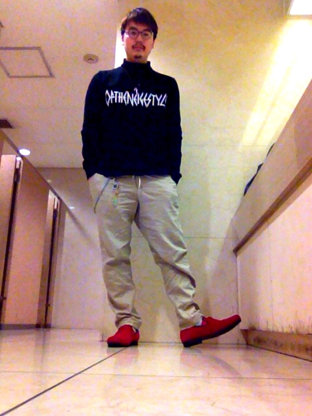レッド系のドレスシューズを着用したメンズの夏コーディネートの1枚目の写真