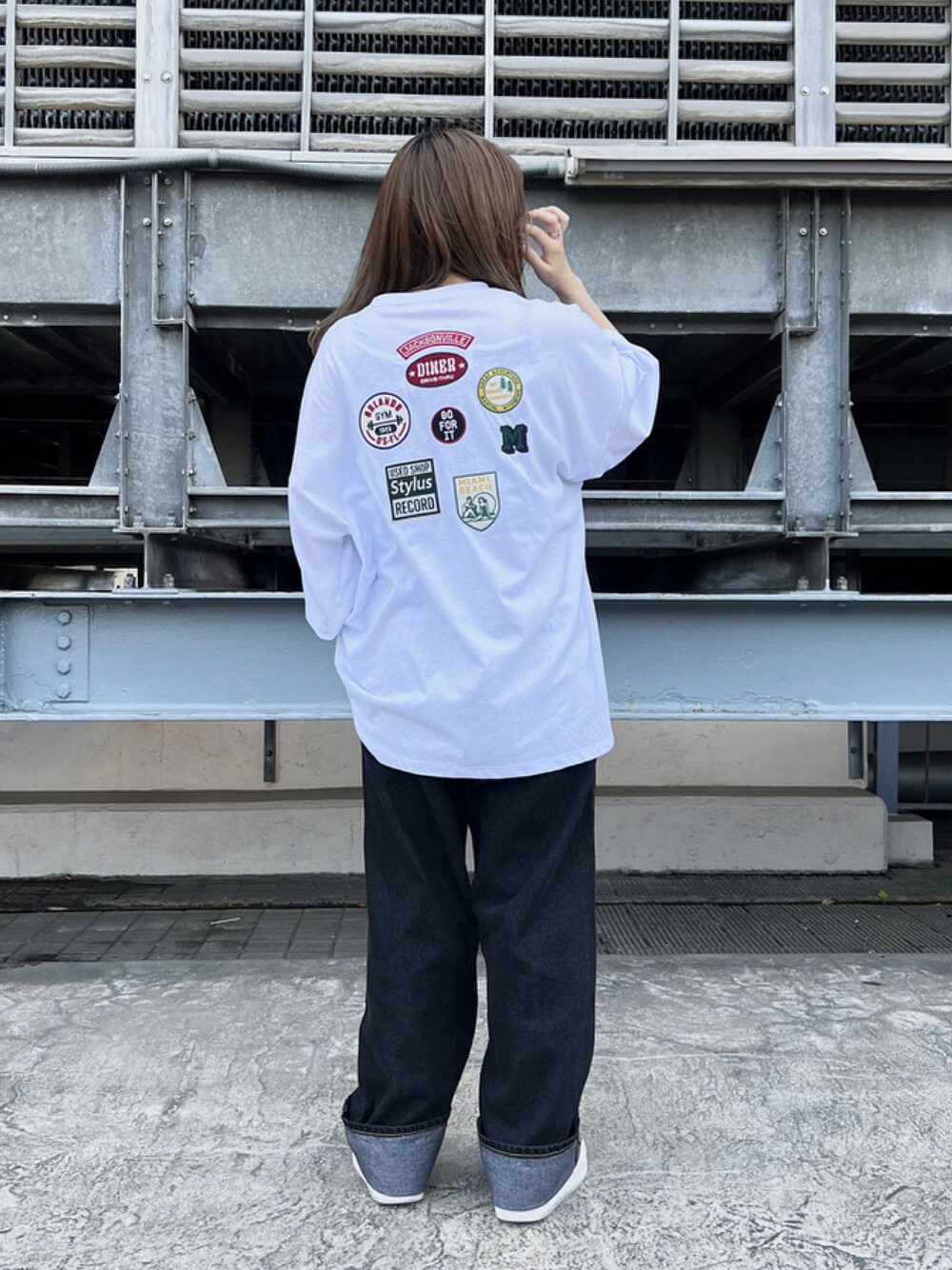 ランダムワッペンルーズTシャツとこめデニムを着用したスタイリングです。 シンプルな白Tとデニムの組み合わせでカジュアルなスタイリングに^^
