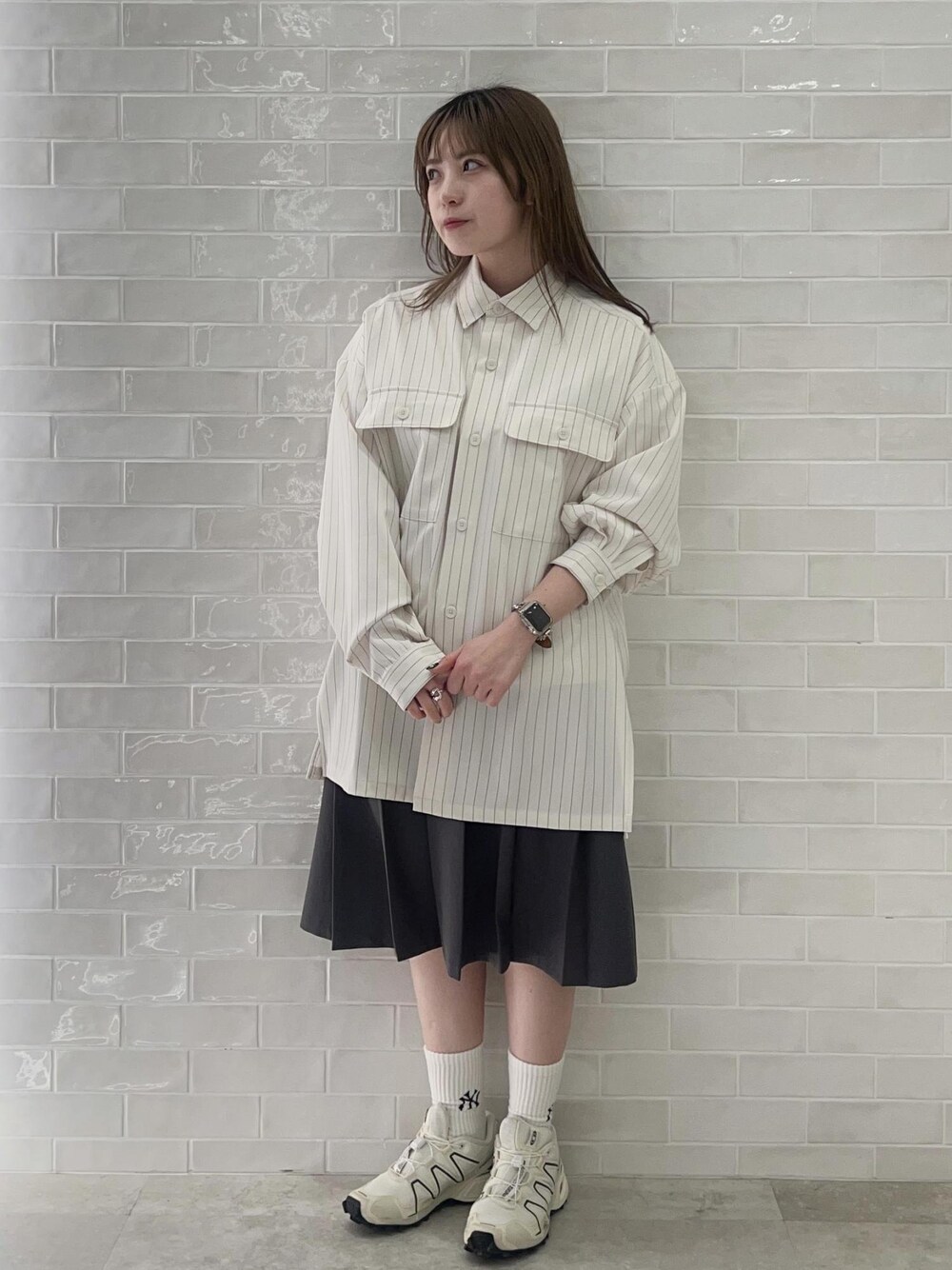 ダブルポケットストライプマキシシャツを着用しました。 ダブルポケットのデザインが可愛いストライプシャツです! プリーツスカートと合わせて、スクール風のちょっとスポーティMIXに着てみました^> ·̫ <^ 生地はそこまで厚くなく、サラッとしています。 ハリがあり落ち感が綺麗なので、ラフすぎないシャツスタイルに◎ ややオーバーサイズですが襟や肩周りはスッキリ綺麗なので女性の方にも是非着て頂きたいです! ※商品カラーはECページをご覧下さい。