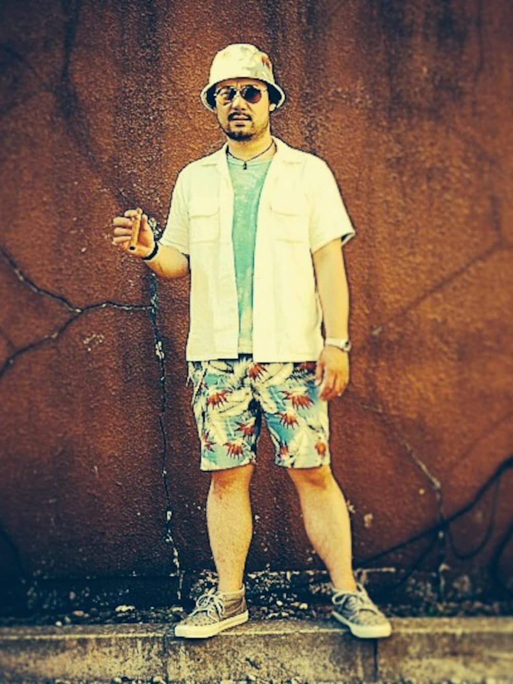 ブルー系のその他パンツを着用したメンズの夏コーディネートの1枚目の写真