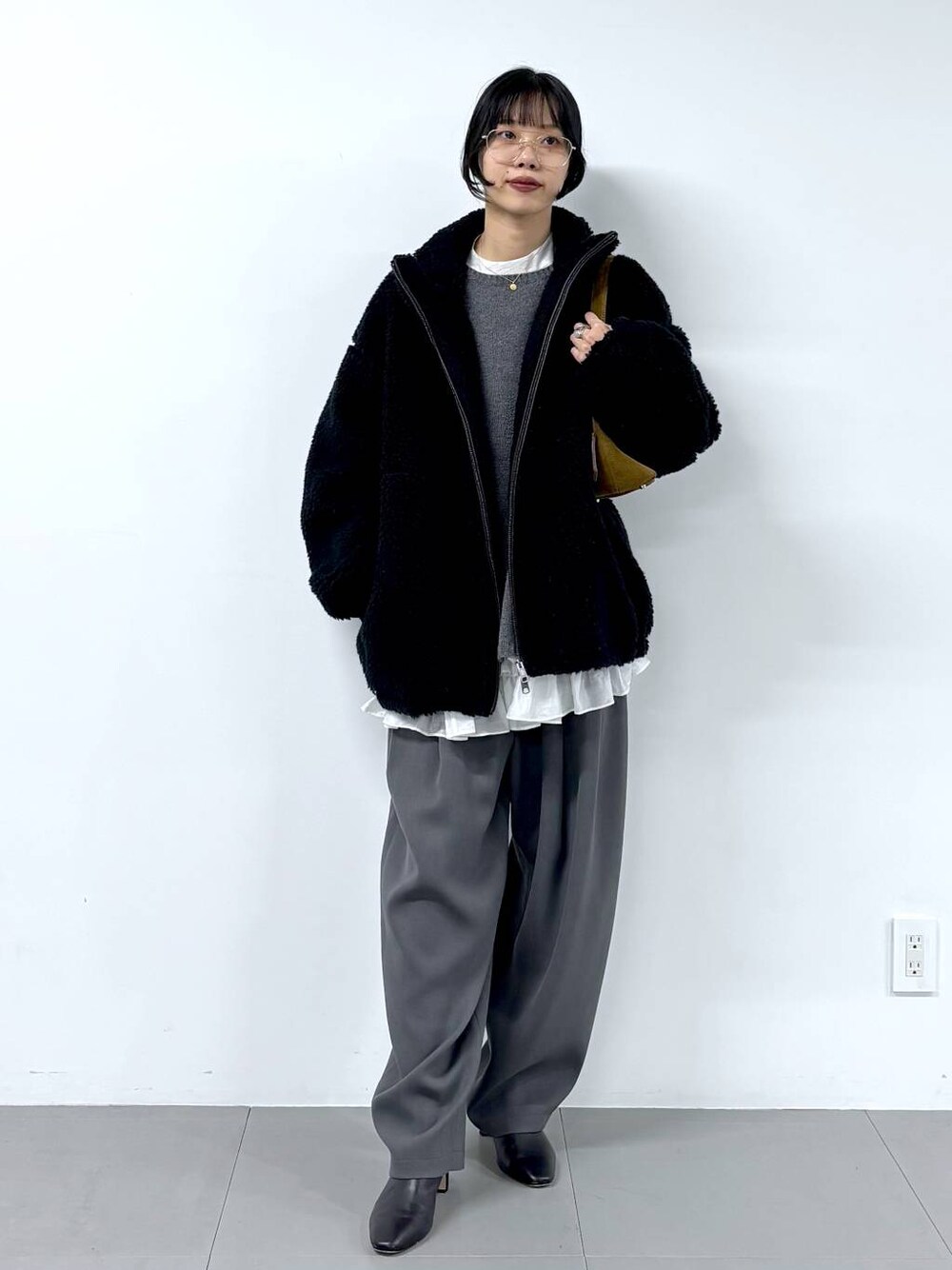 ⭐各アイテムのおすすめポイント  ̄ ̄ ̄ ̄ ̄ ̄ ̄ ̄ ̄ ̄ ̄ ̄ ̄ ̄ ̄ ̄ ̄ 【ニット】 ウルグアイの高山に生息する羊の毛100%で、カシミヤのような肌触りとあたたかさ、軽さが特徴です! ベーシックな形ですが、ほどよいゆるさがオシャレにこなれて使えます◎ 【ブラウス】 少しシアー感のあるブラウスで柔らかい生地なので、張り感なく、レイヤードした際ももこもこしないで合わせられました! フリルは同系色のものと合わせて、少し見せるくらいが大人っぽく着れてオススメです✨ 【ボトムス】 昨年もあったバビロン大人気のタックパンツの秋冬バージョンです! ウール混ですがこちらもチクチクせず、少し光沢感もあるので、フワフワニット合わせても毛があまり付かないです✨ ウエストゴムで楽ちん&股上深めなのでお尻のライン、脚のライン拾いません!! リラックス感ありながらきちんと見えするパンツです◎ 36サイズで裾折らずにジャストで履けます! 【アウター】 ウールが入っているボアアウターでとても軽くて暖かいです! ボア素材にあるあるな、ごわつきも感じにくくカジュアルながらも上品で大人なデザインになっております✨ ゆったりサイズなので、中にニット着てももこもこしづらいです◎ 素材が良いのと、襟元が横に開くデザインが、女性らしさを出してくれるので、ほっこりしにくいデザインですよ♪