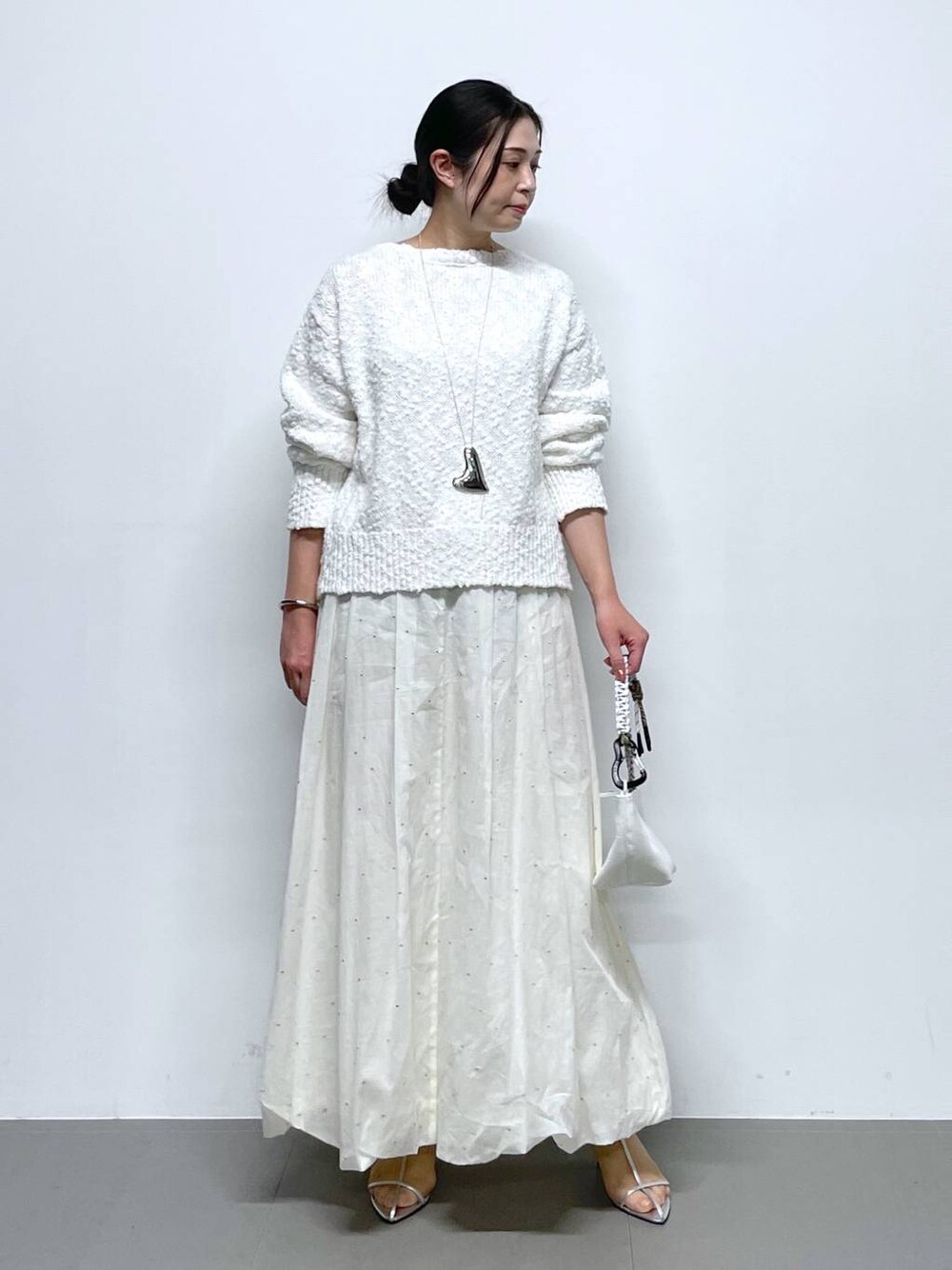 〈身長157cm 骨格ストレート〉 春ニットにバルーンスカートを合わせて🎈 ⭐各アイテムのおすすめポイント  ̄ ̄ ̄ ̄ ̄ ̄ ̄ ̄ ̄ ̄ ̄ ̄ ̄ ̄ ̄ ̄ ̄ 【コットンローゲージプルオーバー】 ふわふわとした雲のような編地のニット☁ 前後2WAYで、ボタンを前にしても着られます。 程よく厚みがあり、まだ寒い時期から着ていただけます。 ローゲージゆえ若干透けるので、インナーを入れると安心です◎ コットン・ポリエステル素材で心地よい肌触り。 ウールのチクチク感が苦手な方におすすめです! 【グリッタードットスカート】 ハリのあるインド綿に、 シルバーのラメ糸でドットを入れたバルーンスカート。 ほのかなシースルー感が春らしい軽やかさを高めてくれます😌 絶妙な生地の分量で、バルーン具合はしっかり出つつ、 全体的なバランスは控えめに仕上がっています。 広がりすぎるスカートが苦手な、 骨格ストレートさんにもおすすめです! ドットも大人らしく上品な存在感なので、 幅広いシーンでご着用いただけます。 4.5cmのヒールと合わせ、ちょうどいい着丈でした! フラットシューズだと床に付いてしまいそうなので、 ヒール合わせがおすすめです。 【WEB限定 NOMADIS YACHT BAG】 毎年大好評のNOMADISのバッグから、新作が登場! 舟形のコンパクトなサイズ感が今の気分。 ロープ×チェーンのコンビネーションや、 カラビナがスタイリングのアクセントに!