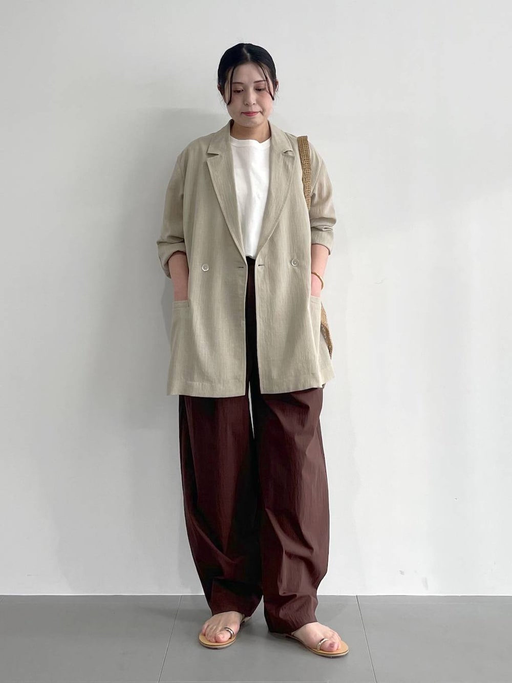 〈身長157cm 骨格ストレート〉 ⭐各アイテムのおすすめポイント  ̄ ̄ ̄ ̄ ̄ ̄ ̄ ̄ ̄ ̄ ̄ ̄ ̄ ̄ ̄ ̄ ̄ 【ジャケット】 シアーシャツジャケット リネンのような見た目ですが、 リネンよりもつるっとした素材感のシアージャケット。 とにかく薄くて軽いです! 暑いシーズンでもジャケットを羽織らないといけないときや、 ジャケットでないとスタイリングが決まらない…!というときでも、 このアイテムがあれば安心です◎ ダブルブレストなので、 ボタンを開けても留めても様になるデザインも魅力。 フリーサイズで、ちょうどおしりがしっかり隠れる着丈です。 若干ドロップショルダーですが、違和感なく着られました。 【トップス】 コットンリネンテンジクノースリ ベーシックな形のノースリーブプルオーバー。 一枚ではもちろん、インナーとしても使える、 ぜひ持っておきたいアイテムです! リネン混素材で、ナチュラルな素材化も魅力。 カジュアルなスタイリングにはもちろん、 ジャケットなどのインナーにもおすすめです◎ 白は若干透けるので、 同系色のインナーを入れていただくのがおすすめです。 【ボトムス】 コットンナイロンタックパンツ 大人気のBABYLONE定番アイテム! ウエスト総ゴムで楽ちんなパンツです。 新色のブラウンを履いてみました🐻 そこまで深みの強すぎない、明るさと赤みを持ったブラウンで、 夏のシーズンから履いていただけますし、 秋シーズンにももちろんおすすめです! シャカシャカした素材ですが、 タックが入り、裾に向かってすぼまるシルエットなので、 きれいめなスタリイングにも🙆🏻♀️ 36サイズ着用で、ギリギリ裾がつかない丈感です。 裾を一折りして履くのも良さそうです。