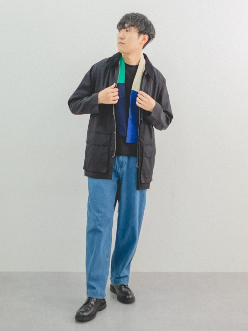 秋冬はアウターで色が重くなりがちなので、明るいデニムで合わせ、ストールでデニムと同系の色を差しました。