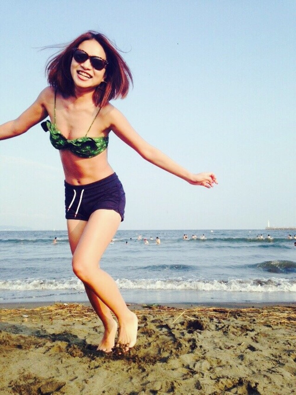 昨日、江ノ島に行った時の ビーチスタイルだよ🌊 バンドゥビキニは去年買ったラグシーの👙 グリーンのビキニに ネイビーのショートパンツを合わせてみたよ✨ 夏になると毎日でも海に行きたいけど 日焼けがこわいよー💦💦笑