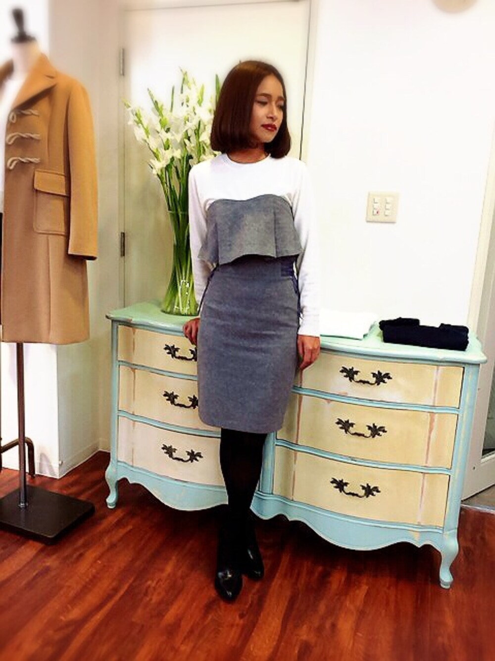 展示会1日目のコーデ トップスはニットとビスチェのセットアイテム✨ これ着てるとかなりスタイルよく見える! 購入決定〜👏