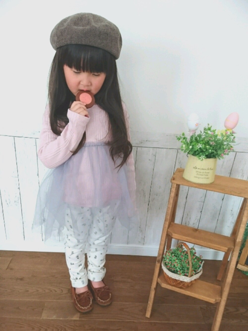 アプレレクールでお買い物♡ チュールが可愛くって ピンク×グレーの組み合わせに♡♡ パンツも冬のアプレレクールのもの ٩(๑❛ᴗ❛๑)۶ いちごのクッキー食べて ごきげんでした♡