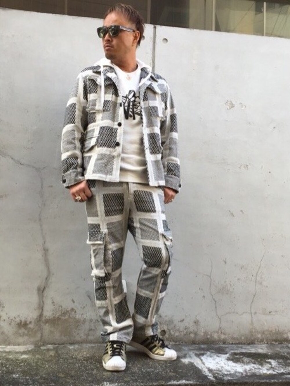 上下セットアップに中パーカーという俺流コーデ! iroquoisらしいインパクトを放つアイテム! 大胆な柄が特徴のワイドカーゴにストレッチ素材が特徴の新しいタイプです! パンツはカーゴの新型ワイドを履いていますがタイトスキニータイプもあります!