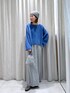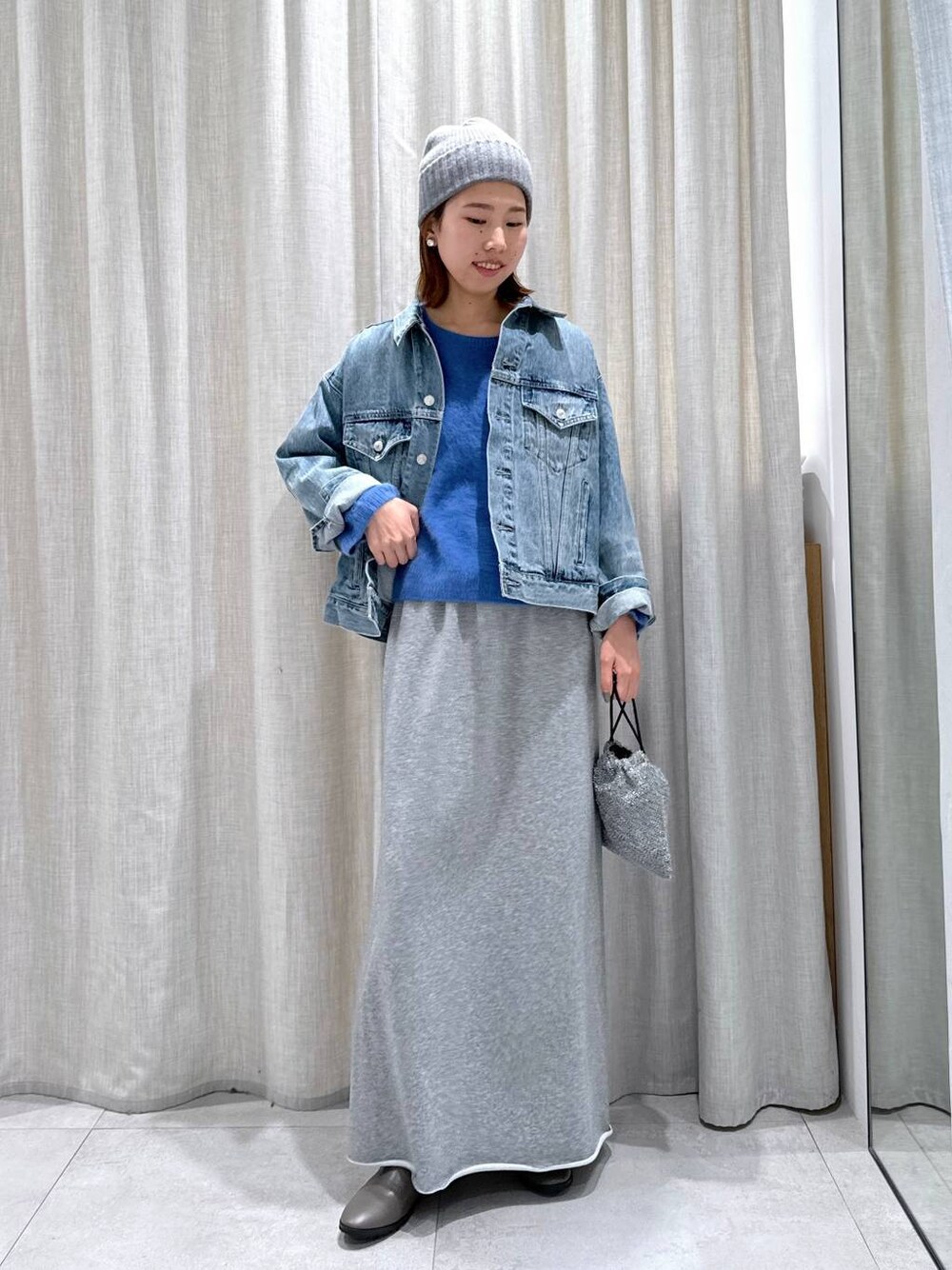 ブルーが映えるカジュアルコーデ☺︎ デニムジャケットやスウェットのようなカジュアルなアイテムも、シャギーのアイテムと合わせるとレディーライクな印象で着られます♪