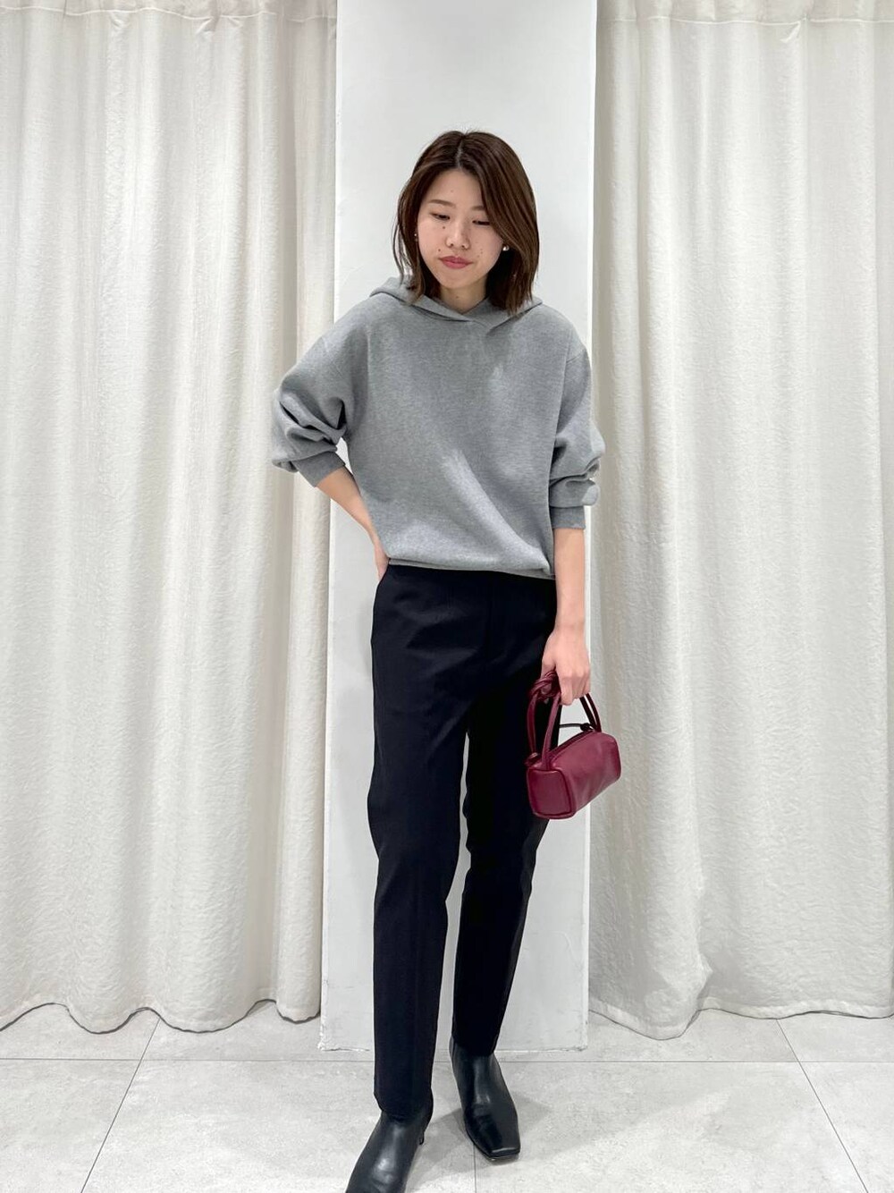 パーカースタイルを大人っぽく♪ レーヨンが入ったニット編みのパーカーなので スウェットのようなカジュアルさはなく、 柔らかい質感が程良く女性らしく着られるアイテムです◎ テーパードパンツ、ショートブーツと合わせて シャープな印象で着てみました!