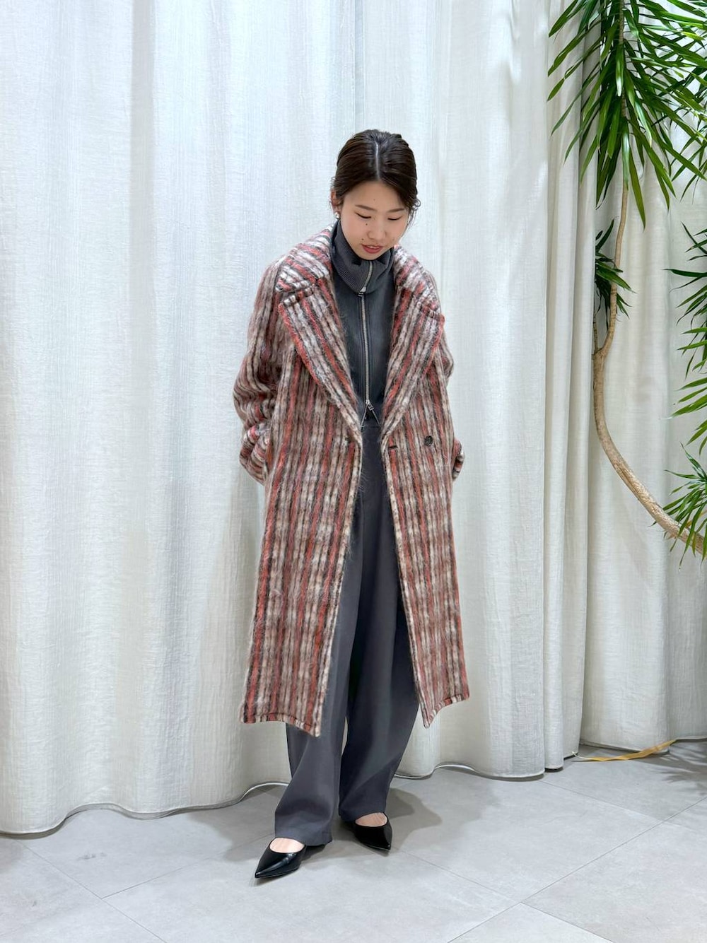 しま(BABYLONE 本部)のチェスターコート「シャギーチェックロングコート」を使ったコーディネート