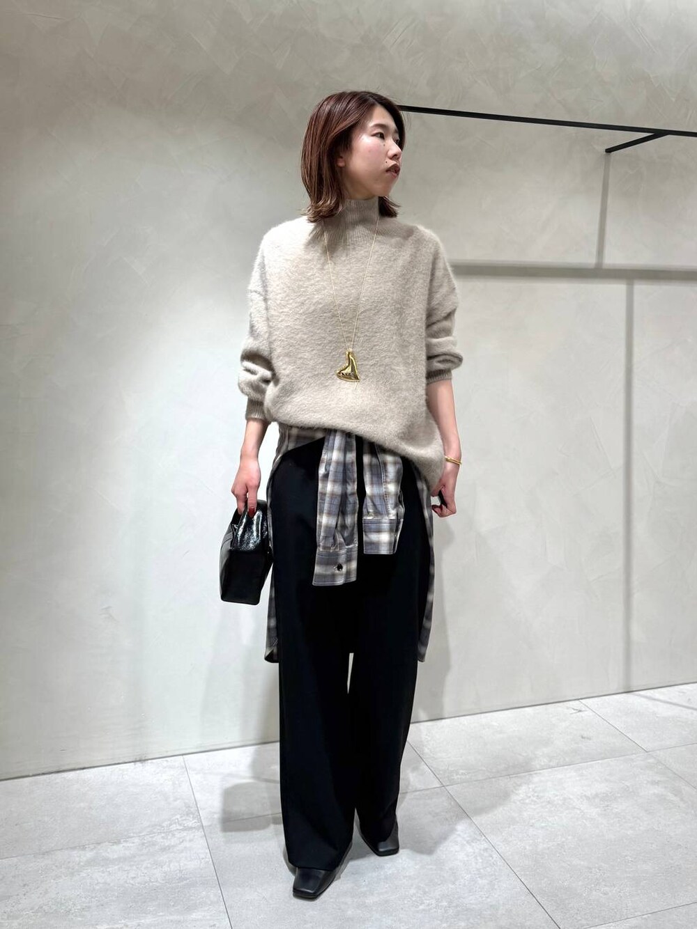 肌触りがふんわり柔らかく保温性抜群のFOXニット。 敏感肌の方にも着ていただけるくらい 毛が細く柔らかい素材です☺︎ タートルネックの華奢さが 緩めなバランスとの相性◎です! 裏起毛パンツはスラックスのような スッキリしたストレートシルエットですが ウエストがぐるっと一周ゴムなので ラクに綺麗に履けるパンツです✨ チェックシャツをとネックレスをワンポイントに コーディネートしてみました!