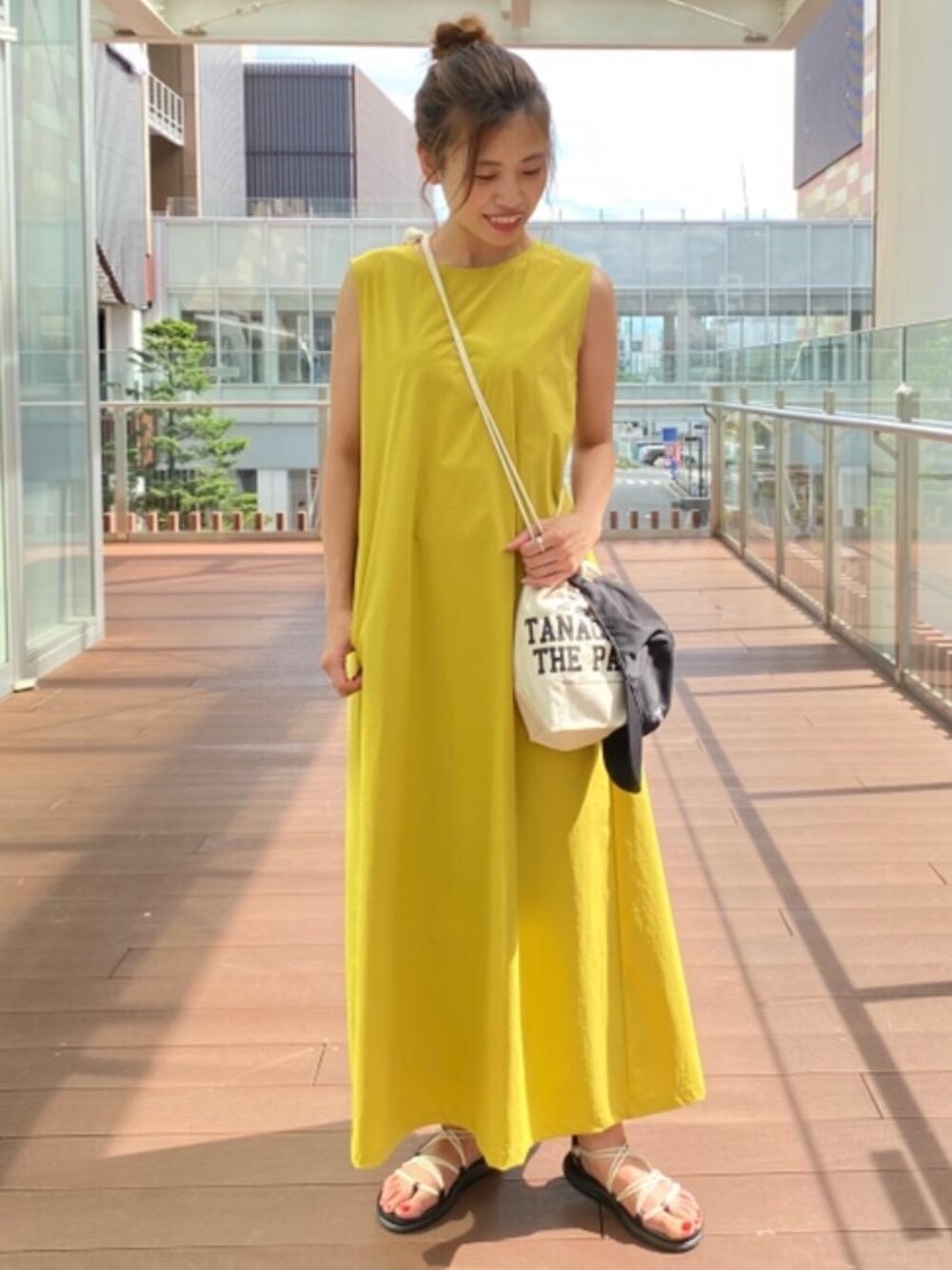 カラーワンピースは日差しの下で映えて、夏のレジャーシーンにピッタリです。スポーティーな小物と合わせてアクティブな印象にまとめました。