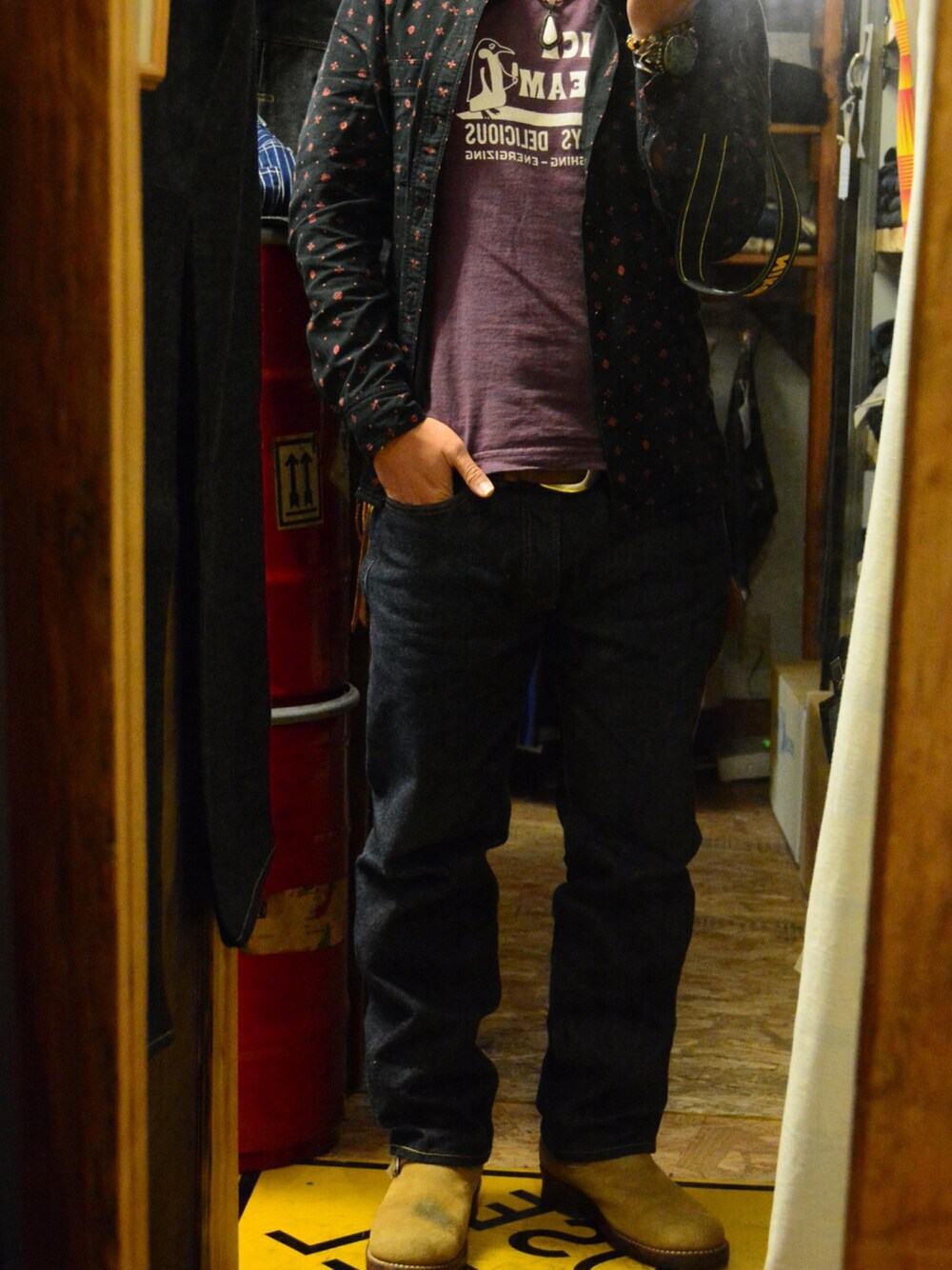 きょーは久々にハーレーちゃん出勤!!! バイク降りたらアウターってほどでもないから レザージャケットは脱ぎ捨てたw てことで、ネイティブ柄抜粋ワークシャツに ウエスのペンギンアイスクリームTしゃつ 1日がんばりましょ^^