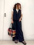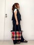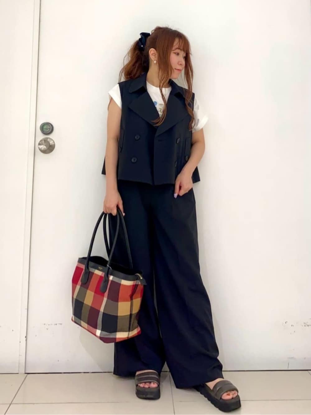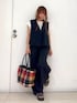 ショートベストとワイドパンツのセットアップコーデ。赤チェックのトートバッグをアクセントに。Tシャツ×パンツのカジュアルラインですが、ベストを取り入れることで一気にトレンド感あるコーディネートが完成します。