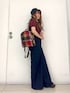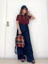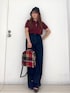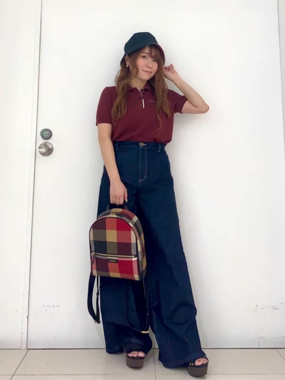 ポロシャツライクなニットとデニムワイドパンツのコーデ。 赤チェックのPVCリュックをアクセントに加えました。 ポロニットは、カジュアルにも綺麗めにもふれるシンプルなデザインです。 無地パンツやスカートなど幅広いアイテムと合わせられます。
