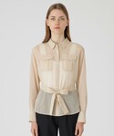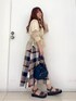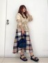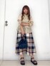 長袖シアーシャツ×クレストブリッジチェック柄スカートのコーデ。 全体をベージュのトーンで統一しました。 透け感のあるシアーシャツは夏から秋にかけても使える万能アイテム。 柄スカートの他にデニムやパンツなど、幅広いボトムと組み合わせ可能です。