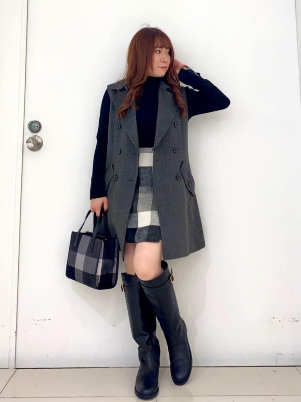 ウールジレに同素材の巻きスカートとリブニットを合わせました。 全体をブラック、グレーで統一しました。 ジレはトレーナーやニットの上から羽織るだけでおしゃれに決まります。 スカートやパンツなど幅広いアイテムと相性抜群です。