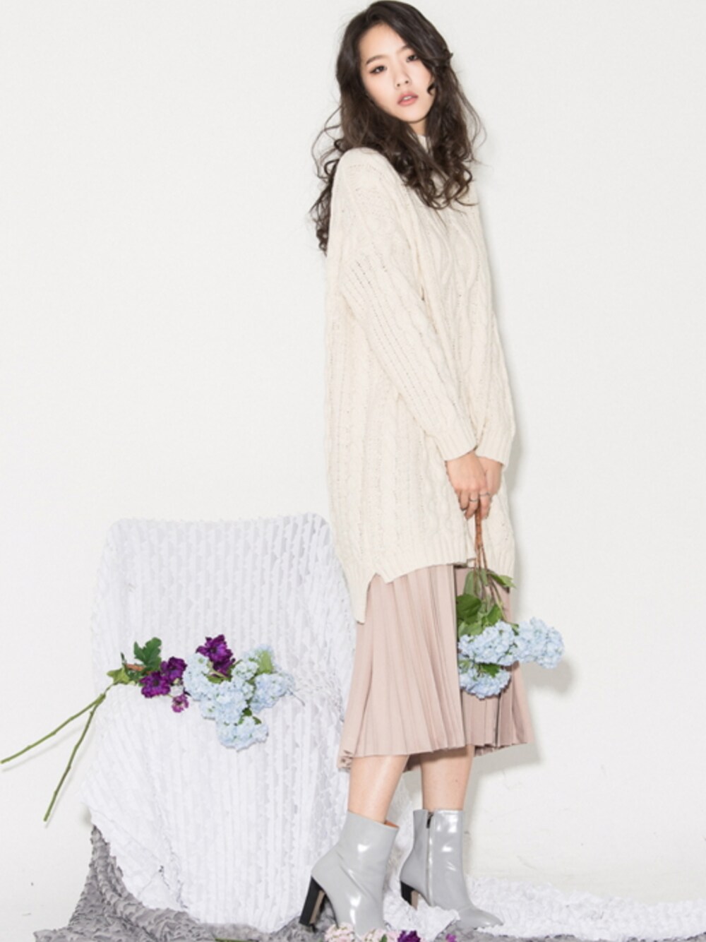bluepopsのニット/セーター「ケーブル編みタートルネックロングニットトップス」を使ったコーディネート