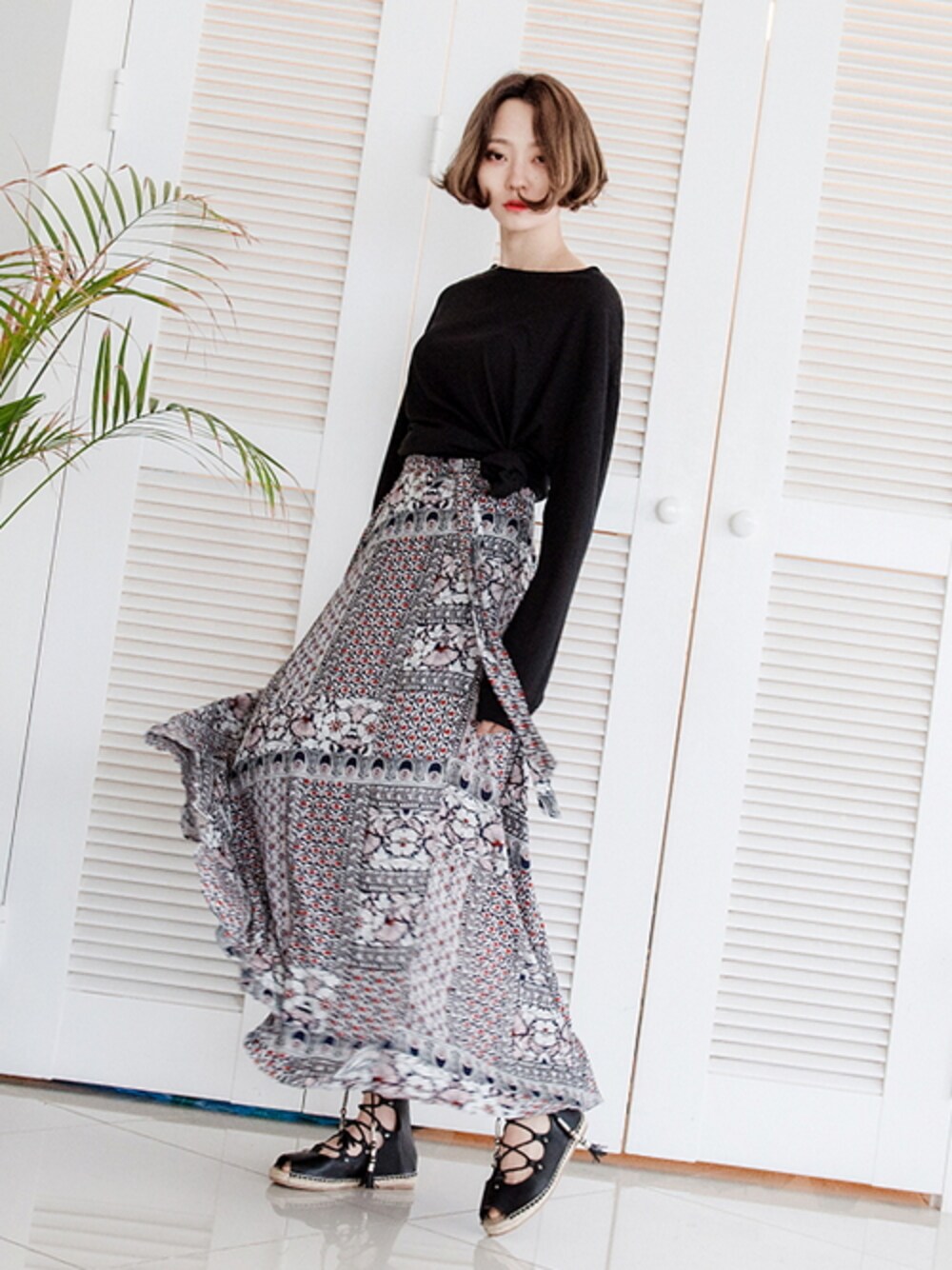bluepopsのスカート「エスニカルフラワーラップマキシスカート」を使ったコーディネート
