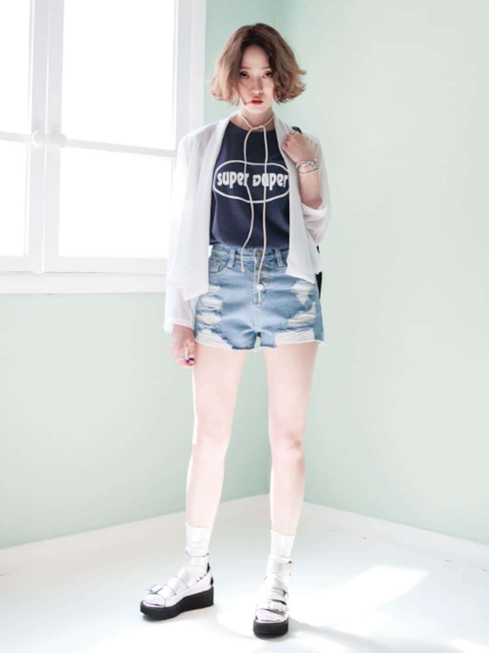 bluepopsのその他アウター「シフォンショールカラーショートジャケット」を使ったコーディネート
