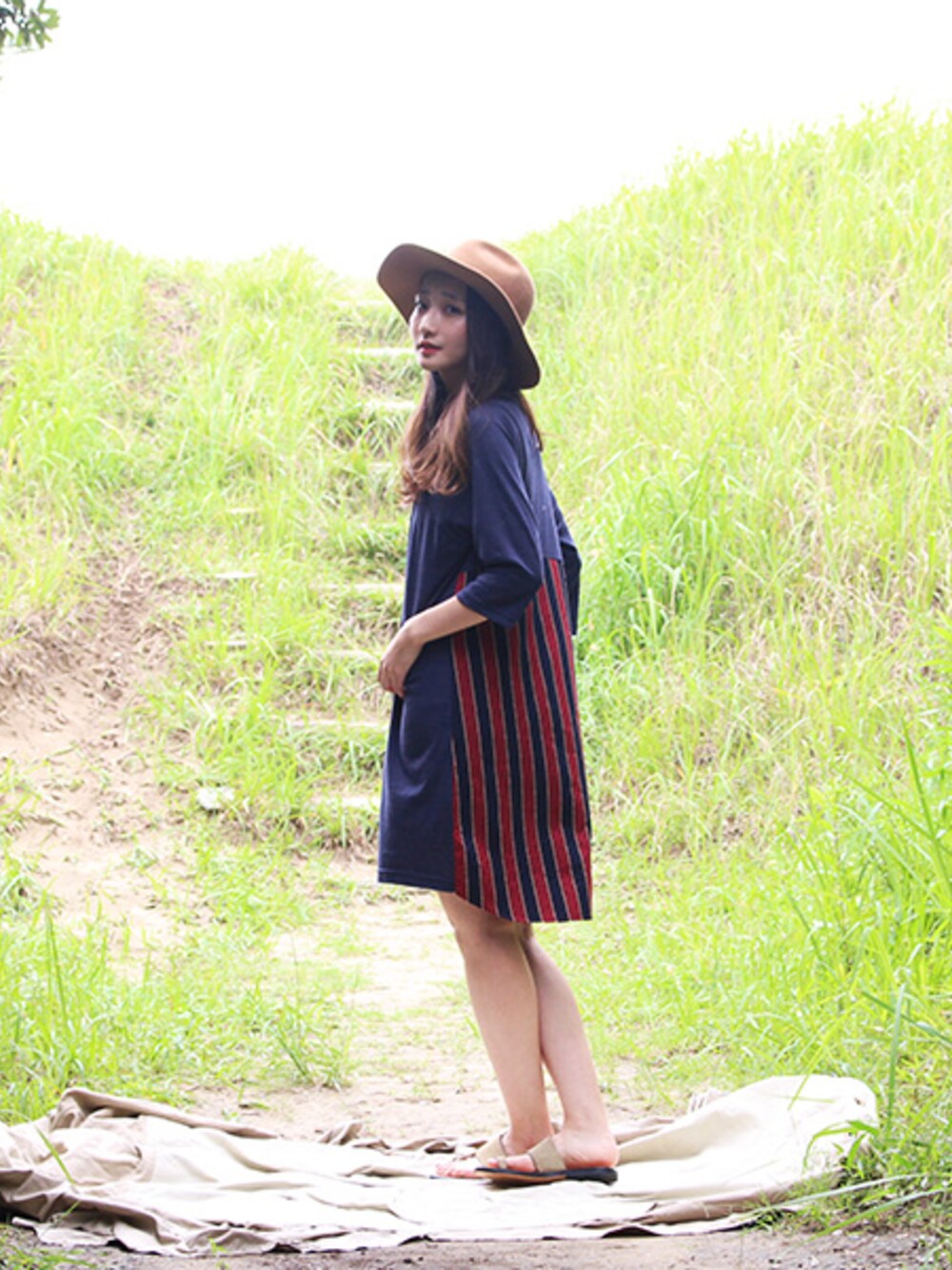 もともとメンズのカットソーとしてデザインされたものをレディース用にワンピースにしてしまったというアイテムを、夏らしくあえて一枚で着てみました。 カジュアルになりすぎそうなところを、ハッとで少し大人っぽく。サンダルもビーサンではなく、デザイン性のあるもので。 前から見たときと後ろからみたときのギャップがたまりませんね。ギャップに弱いもんですね、人間って。