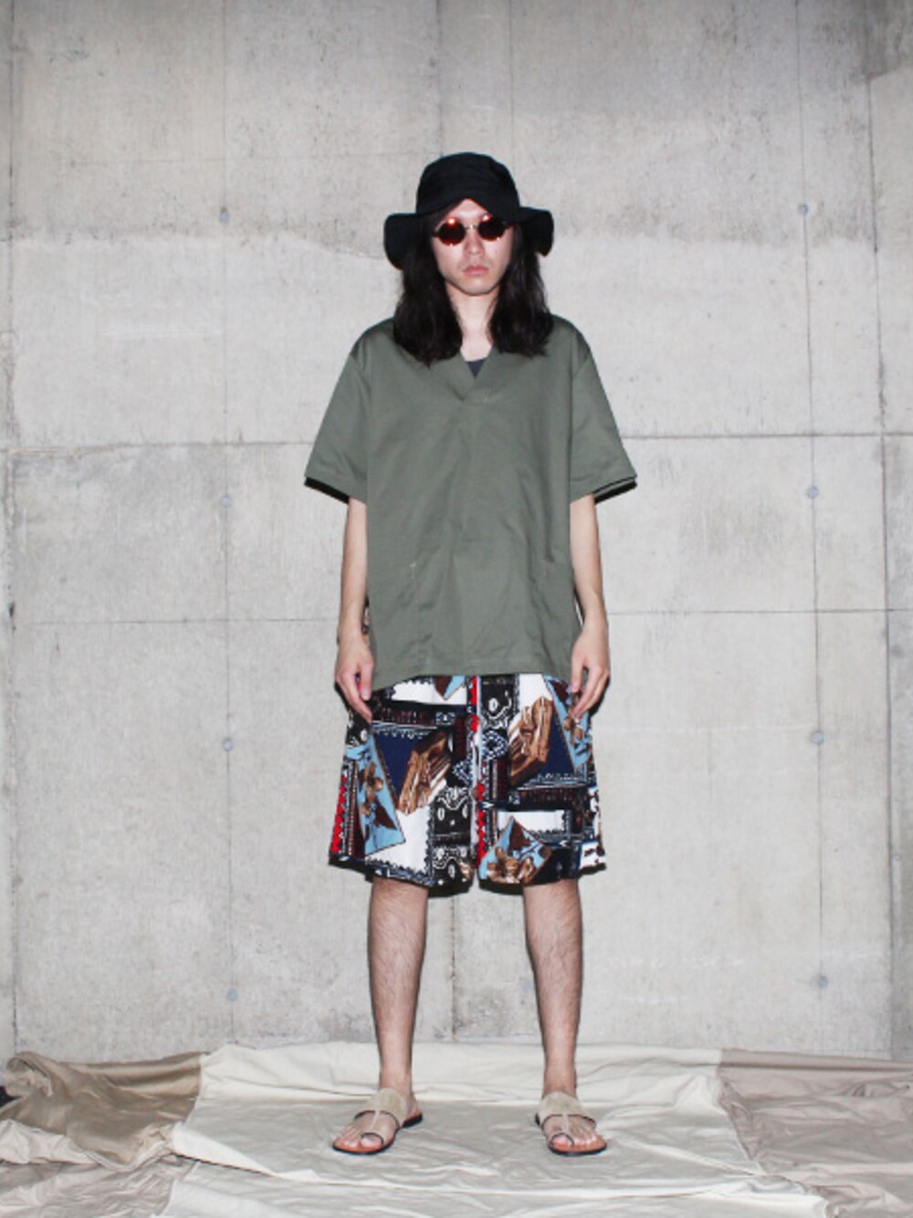 もはや夏の定番となった無地のVネックTシャツ。ただ、これはただのTシャツじゃなくシャツ生地なのです。生地が異なるだけでなんとなく雰囲気も見た目も一風変わります。 パンツはビッグシルエットのショートパンツ。レーヨンのような柔らかい素材が心地よいです。夏の柄パンももはや定番ですが、古着ならではのこれだけのインパクトをもつものはいかがでしょうか。 年をとるとリラックス重視になってしまいます。いかんです。